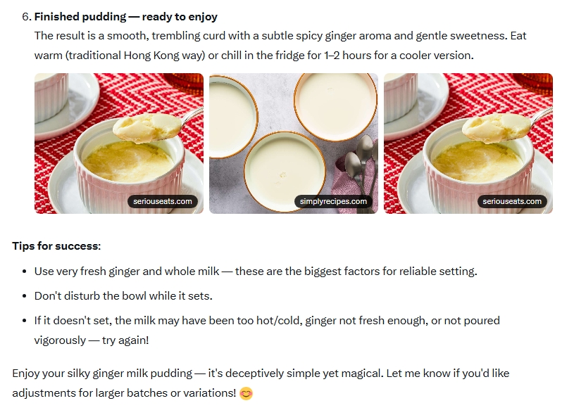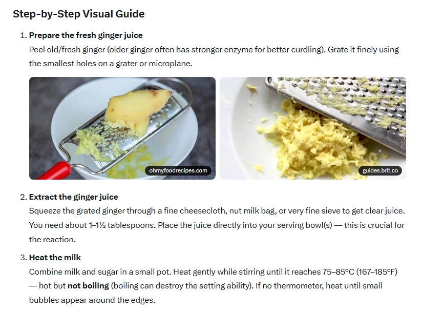 [2] If plain ginger tea feels too strong or unpalatable, consider Hong Kong-style ginger milk pudding (also known as ginger milk curd or 姜汁撞奶) as a gentler alternative. Here is a Grok AI summary of key tips for success: