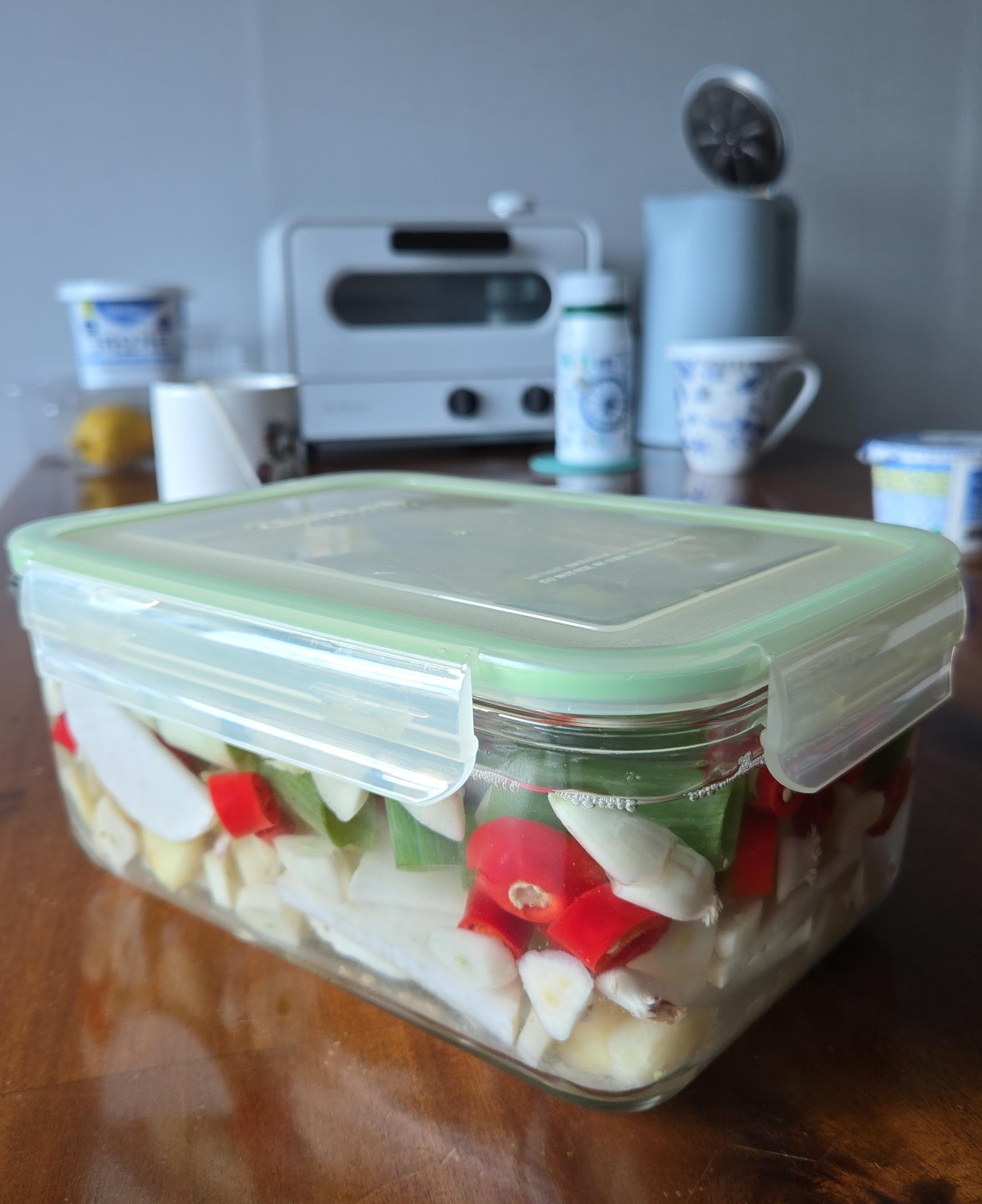The radish, green onions, garlic, red chili peppers, and ginger can all be stored for at least 3 months while maintaining good texture.